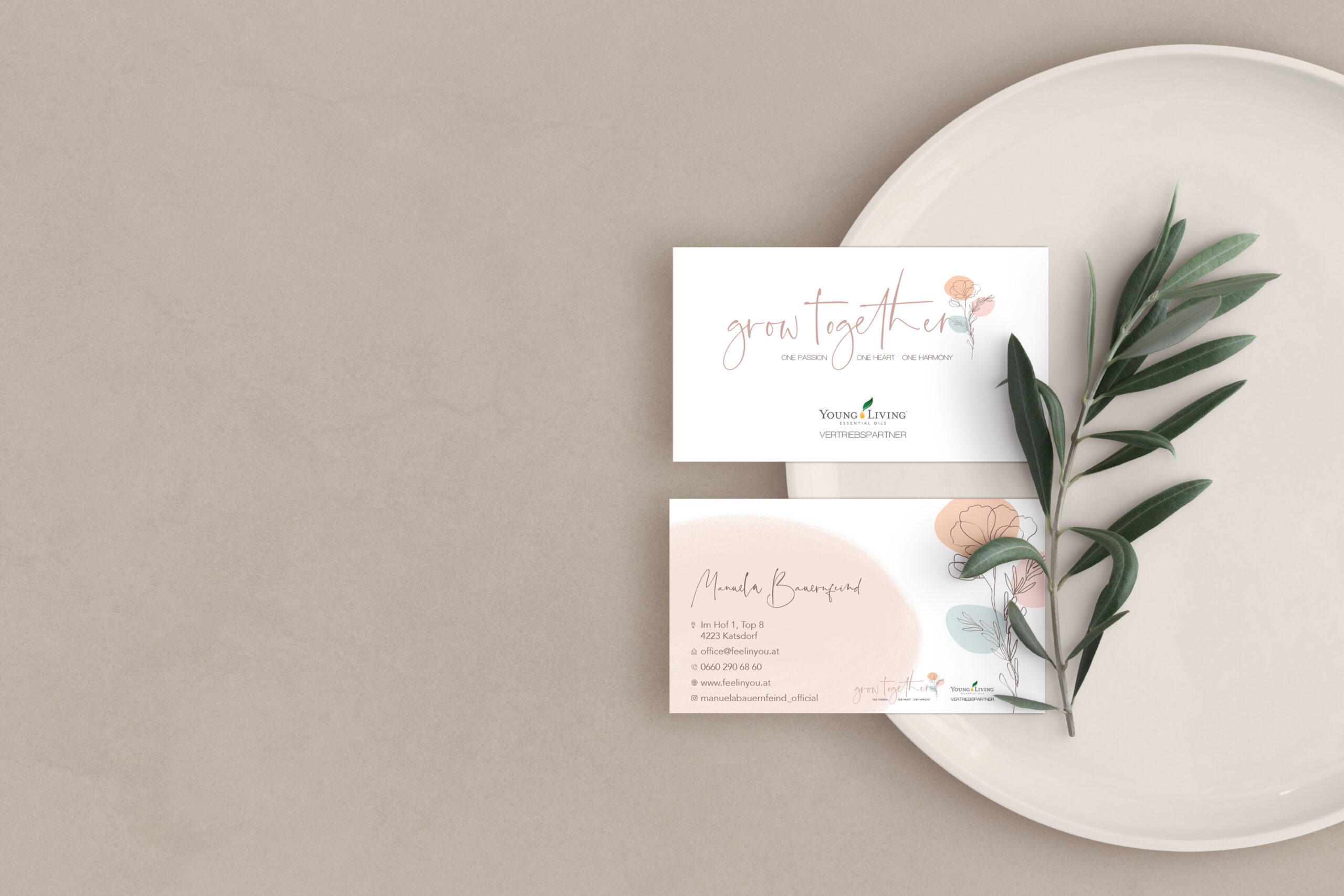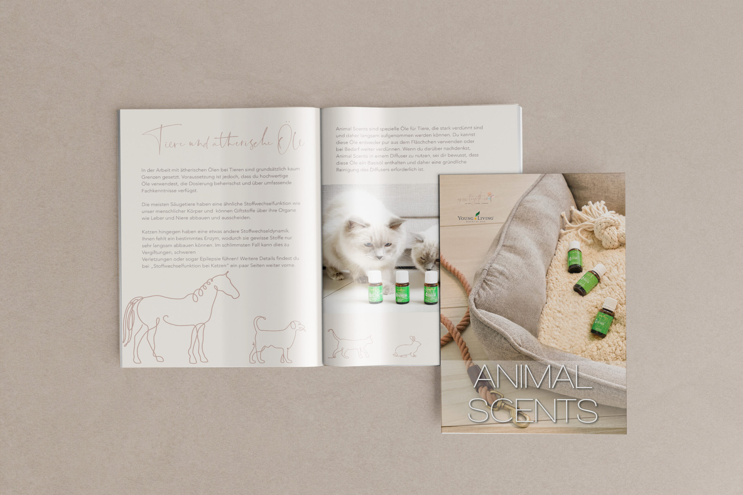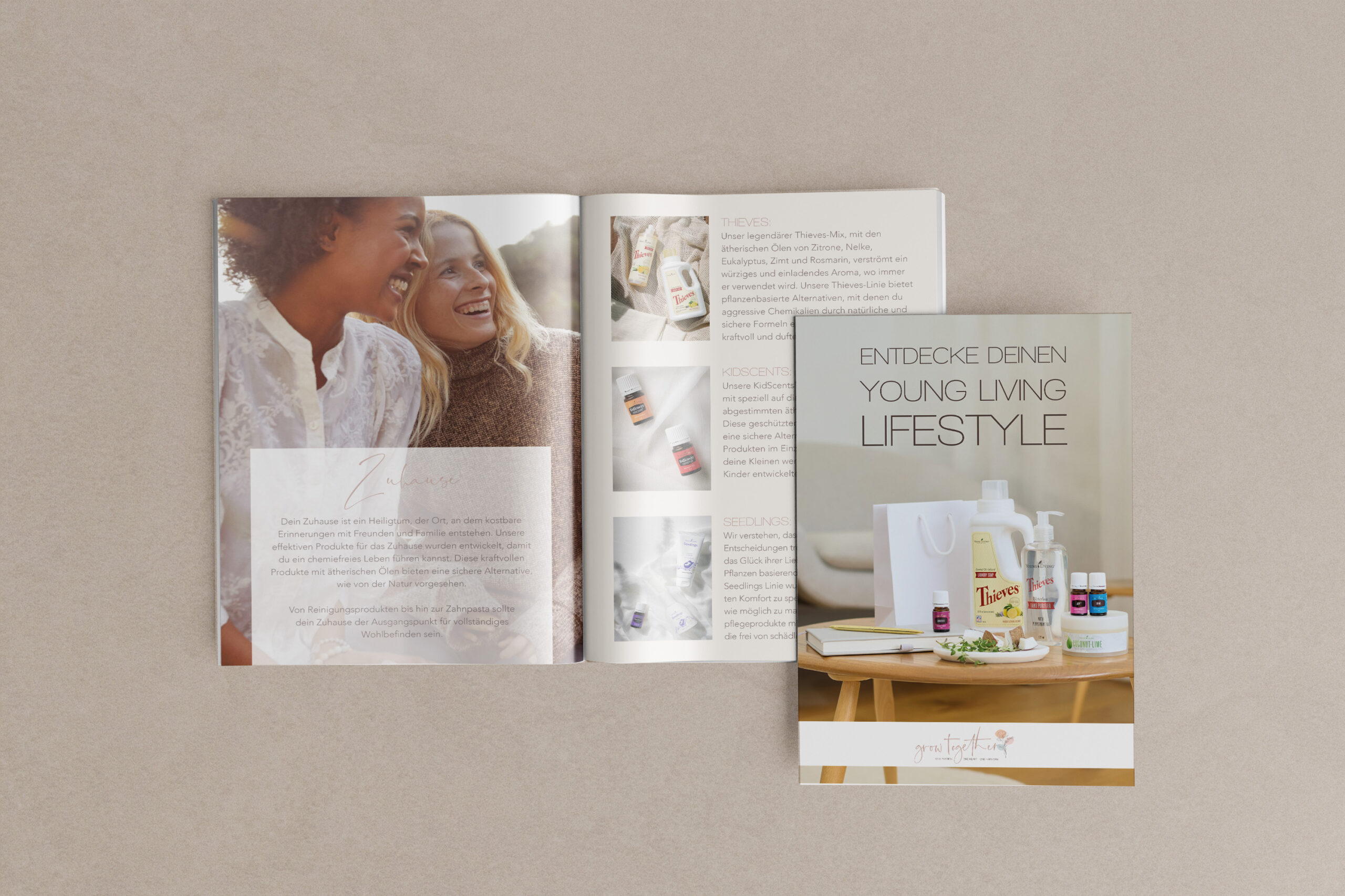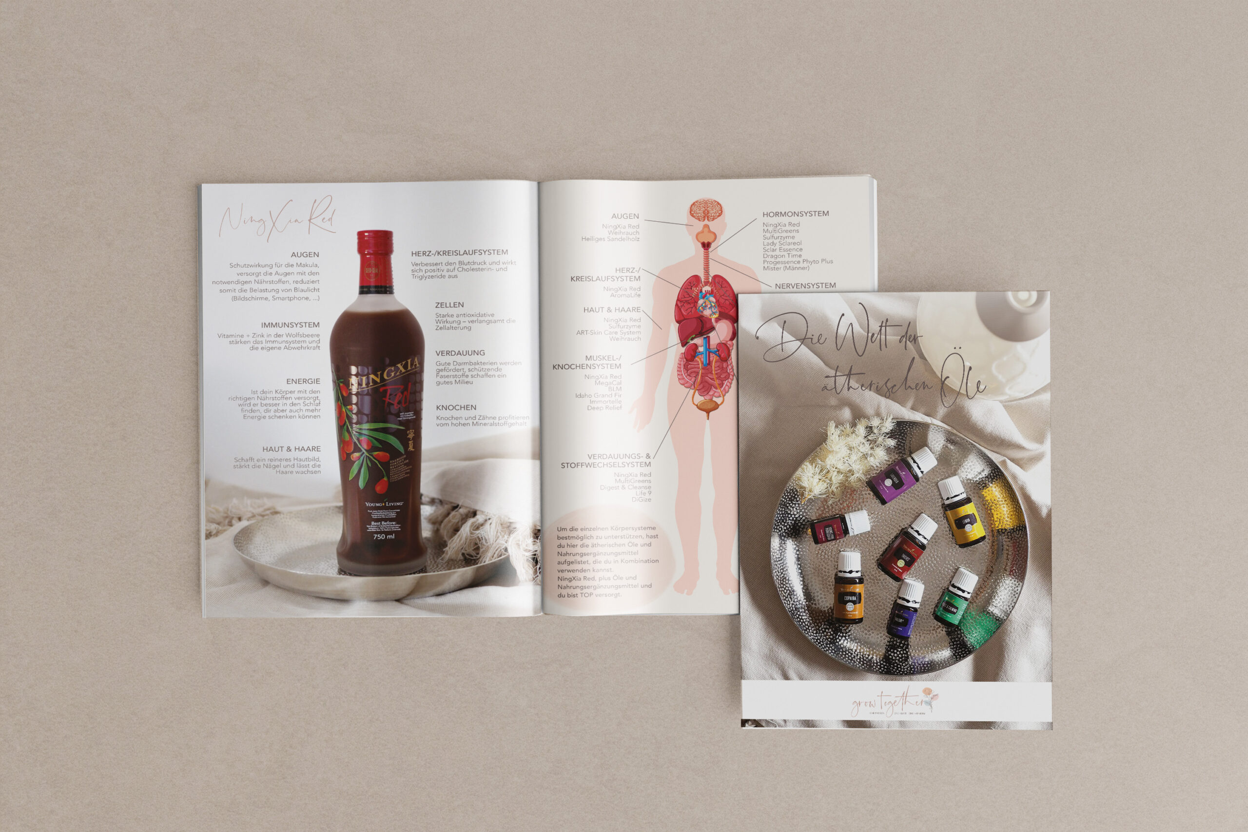 Neben dem Logo und der Visitenkarte wurden viele Broschüren über das Wissen der ätherischen Öle erstellt, welche eine konsistente und professionelle Markenpräsenz gewährleisten.